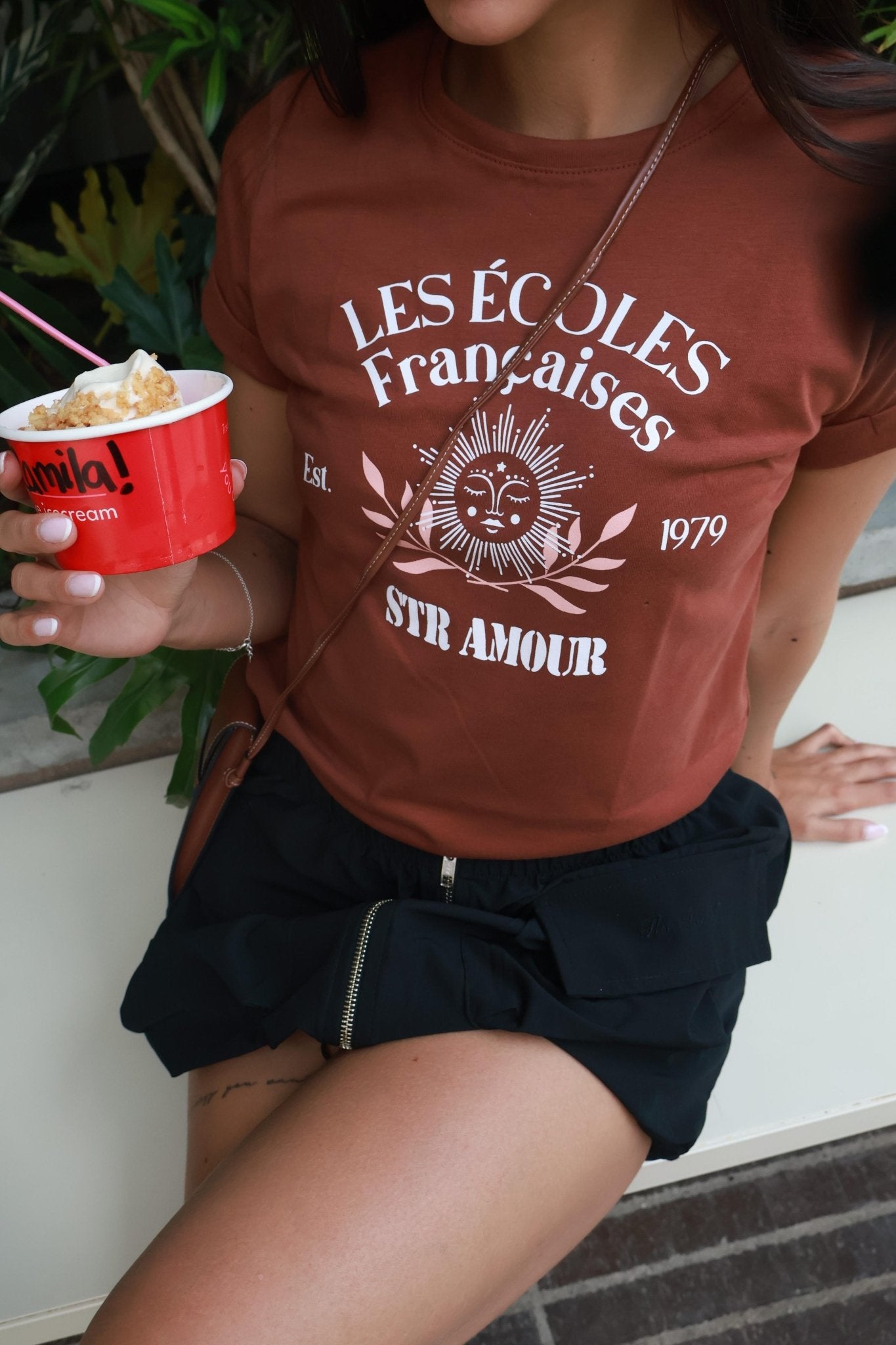 Material : 100% algodón peruano, camiseta color Terracota estampado solar str, La modelo usa talla S, Hecho en Medellín Colombia DESPACHO 8 DE SEPTIEMBRE